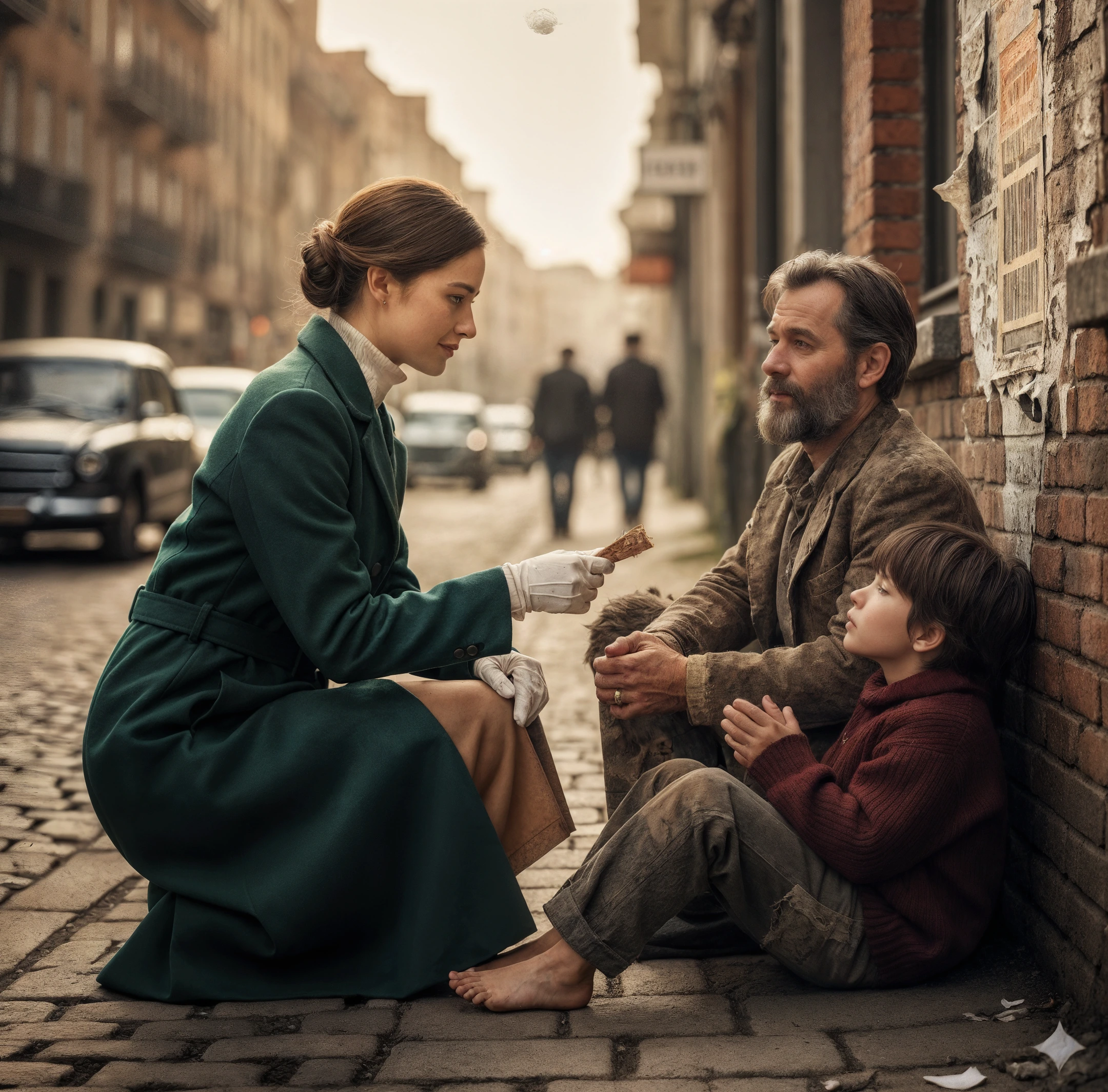 Diversi passanti lanciano loro delle monete senza guardarli, altri fanno finta di non vederli. Mateo è già triste quando una donna si ferma davanti a loro. È giovane, avrà poco più di vent’anni; indossa una divisa blu da addetta alle pulizie e scarpe da ginnastica consumate. Il viso è stanco, ma gli occhi sono dolci.