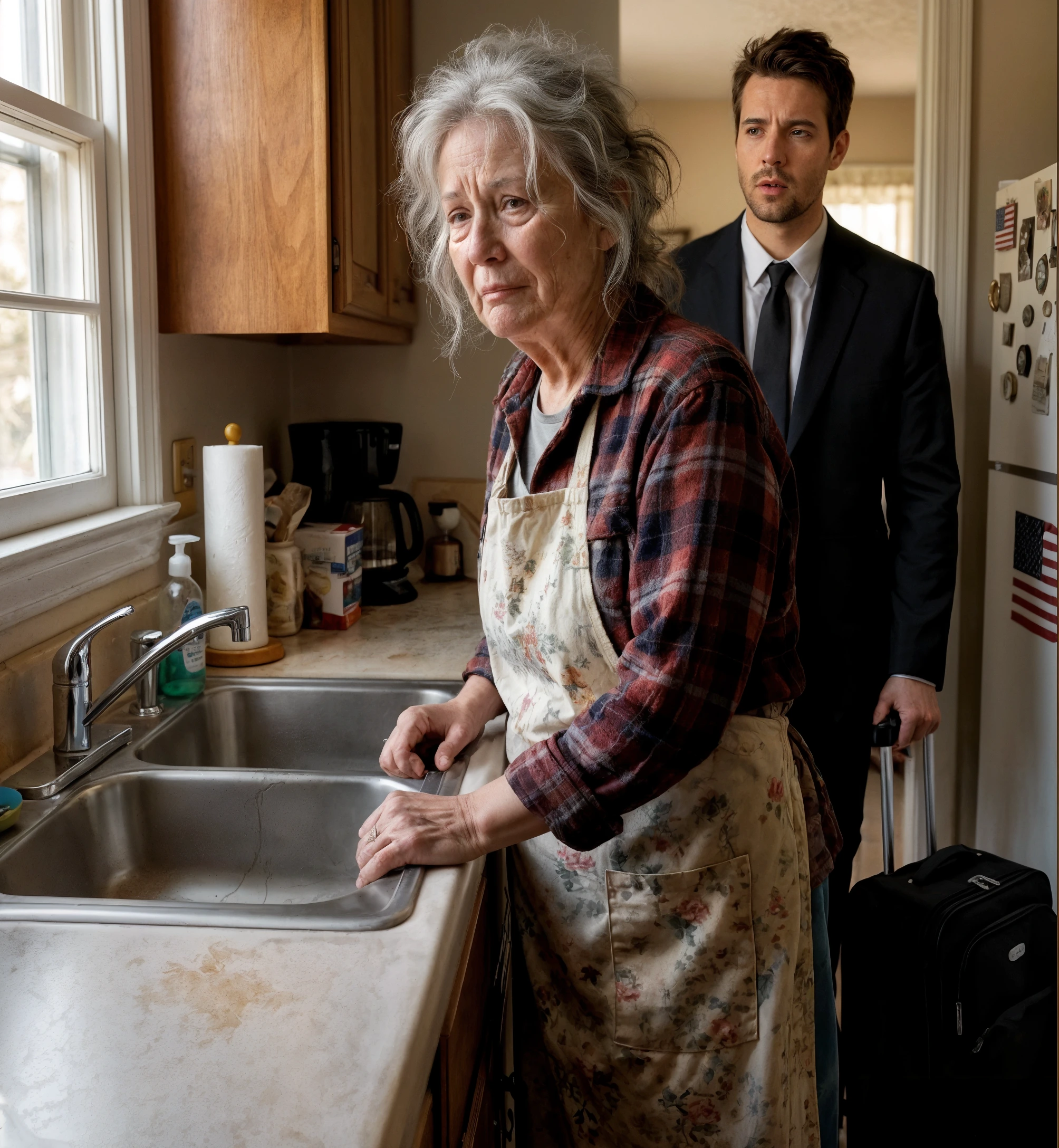 Mia madre era in piedi al lavello, con indosso lo stesso grembiule a fiori che aveva da anni. Eppure qualcosa non andava. Le mani le tremavano. Le spalle erano incurvate, non solo per l’età, ma per la paura. Vidi le lacrime scenderle sul viso mentre fissava il vuoto.