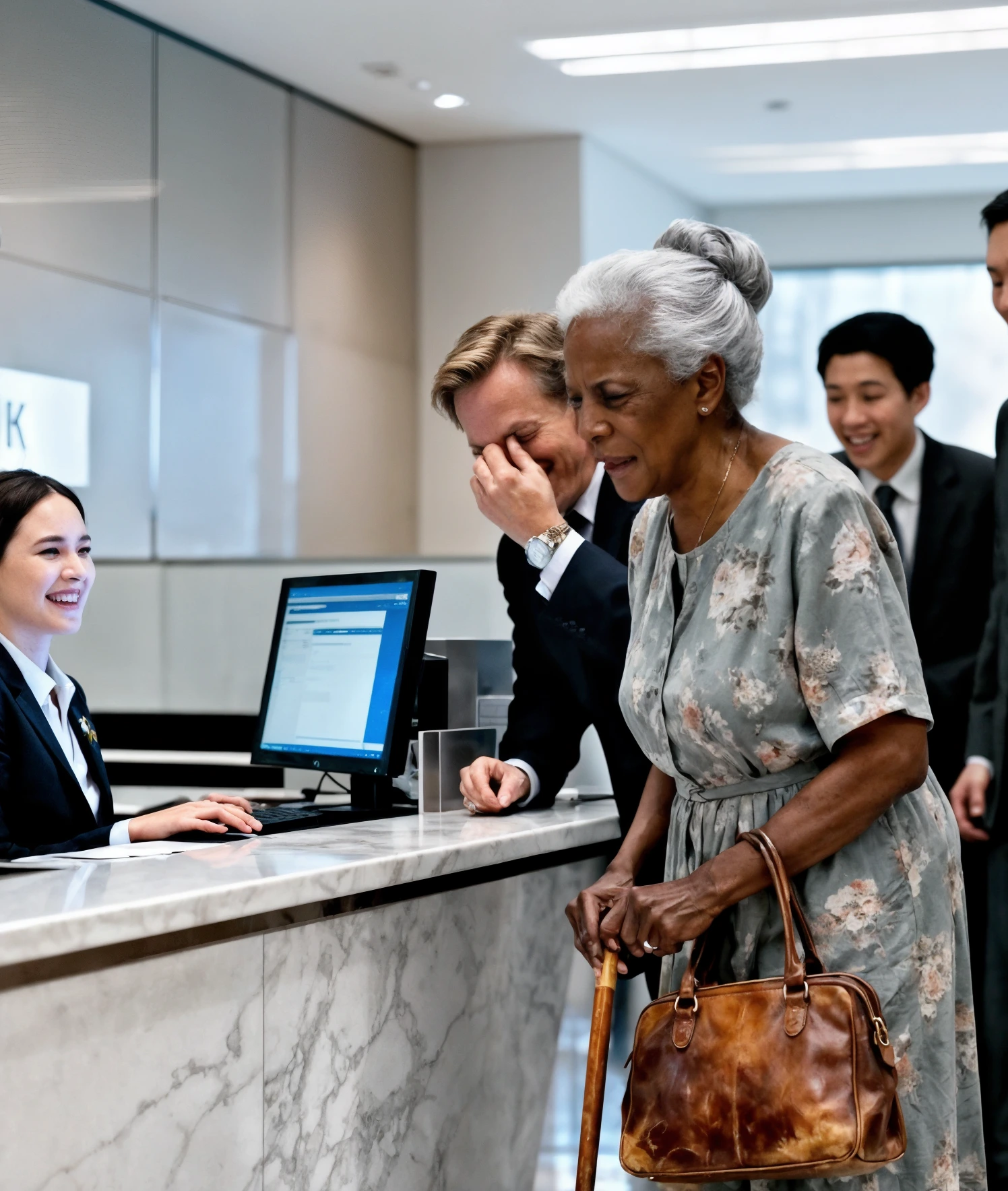 Poi entrò la signora Evelyn Thompson: una donna nera di 90 anni, vestita con un semplice abito a fiori un po’ consumato, scarpe ortopediche usurate e una borsa sbiadita stretta forte tra le mani artritiche. I capelli d’argento erano raccolti con cura, e si muoveva lentamente aiutandosi con un bastone di legno.