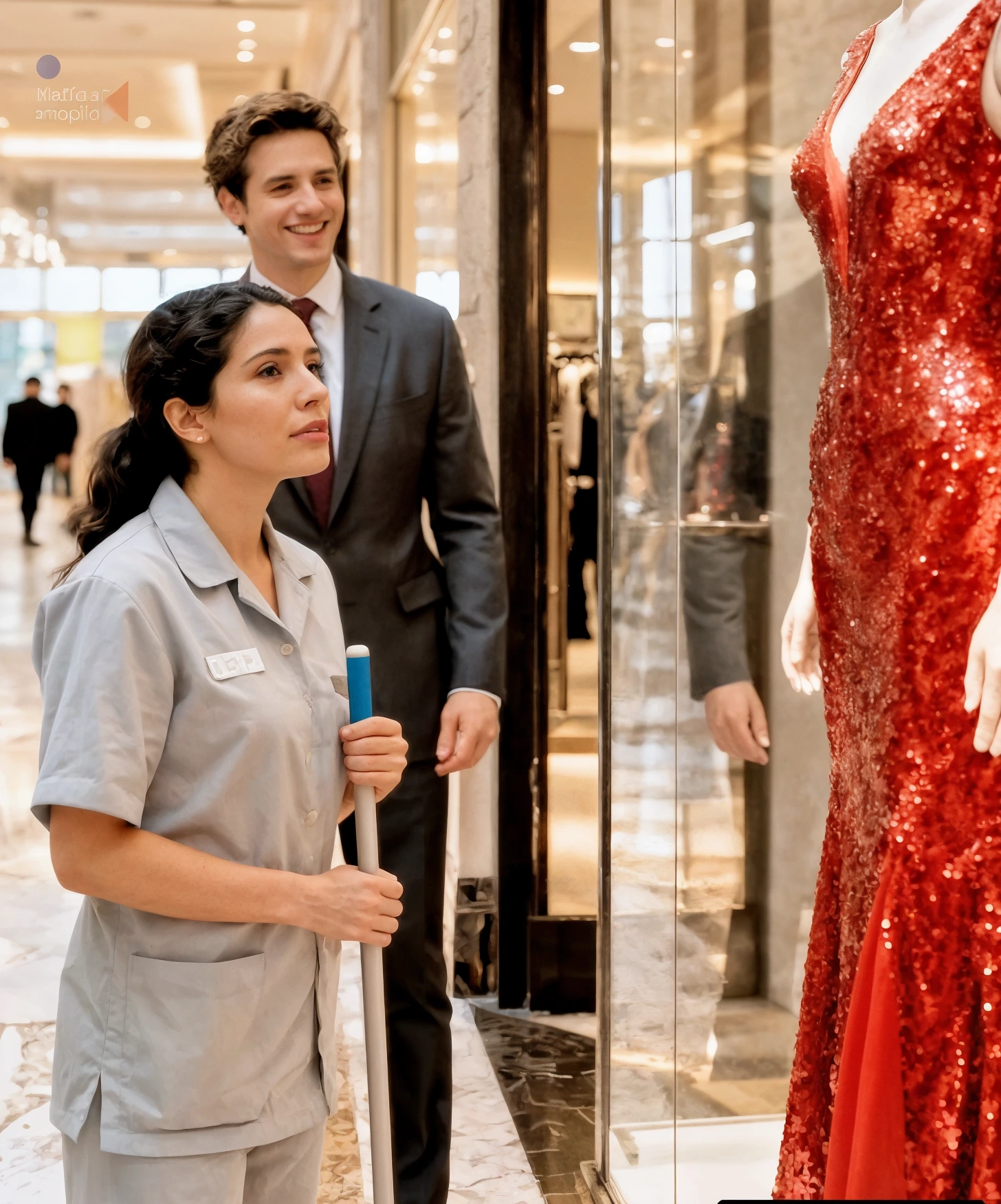 Indossava una semplice divisa grigia da donna delle pulizie. Un cartellino con il nome. Scarpe comode. In mano teneva un mocio, fermo a mezz’aria, come se il tempo si fosse congelato. I capelli erano raccolti in fretta, con qualche ricciolo sfuggito sulla nuca.