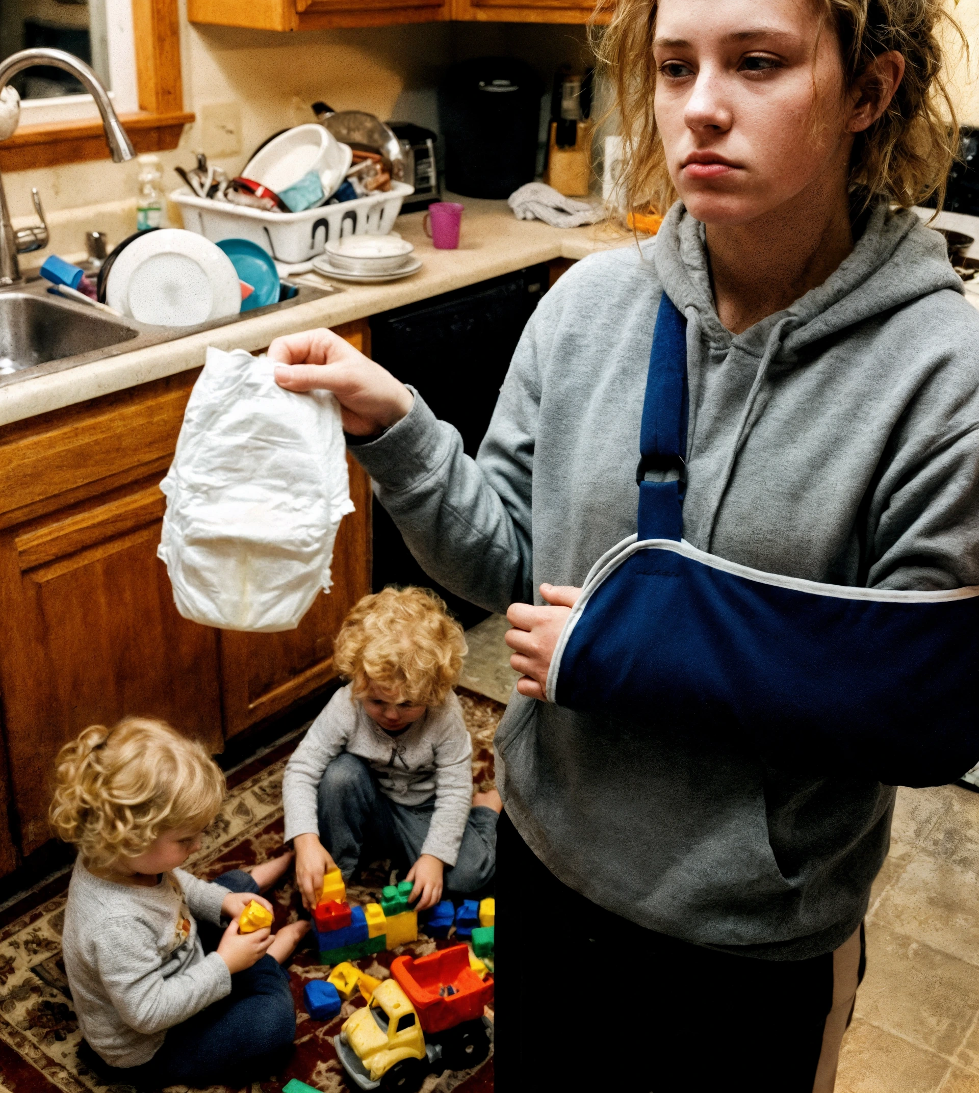 Olivia ha cucinato, pulito, inseguito i bambini, cambiato pannolini… tutto con un braccio immobilizzato.