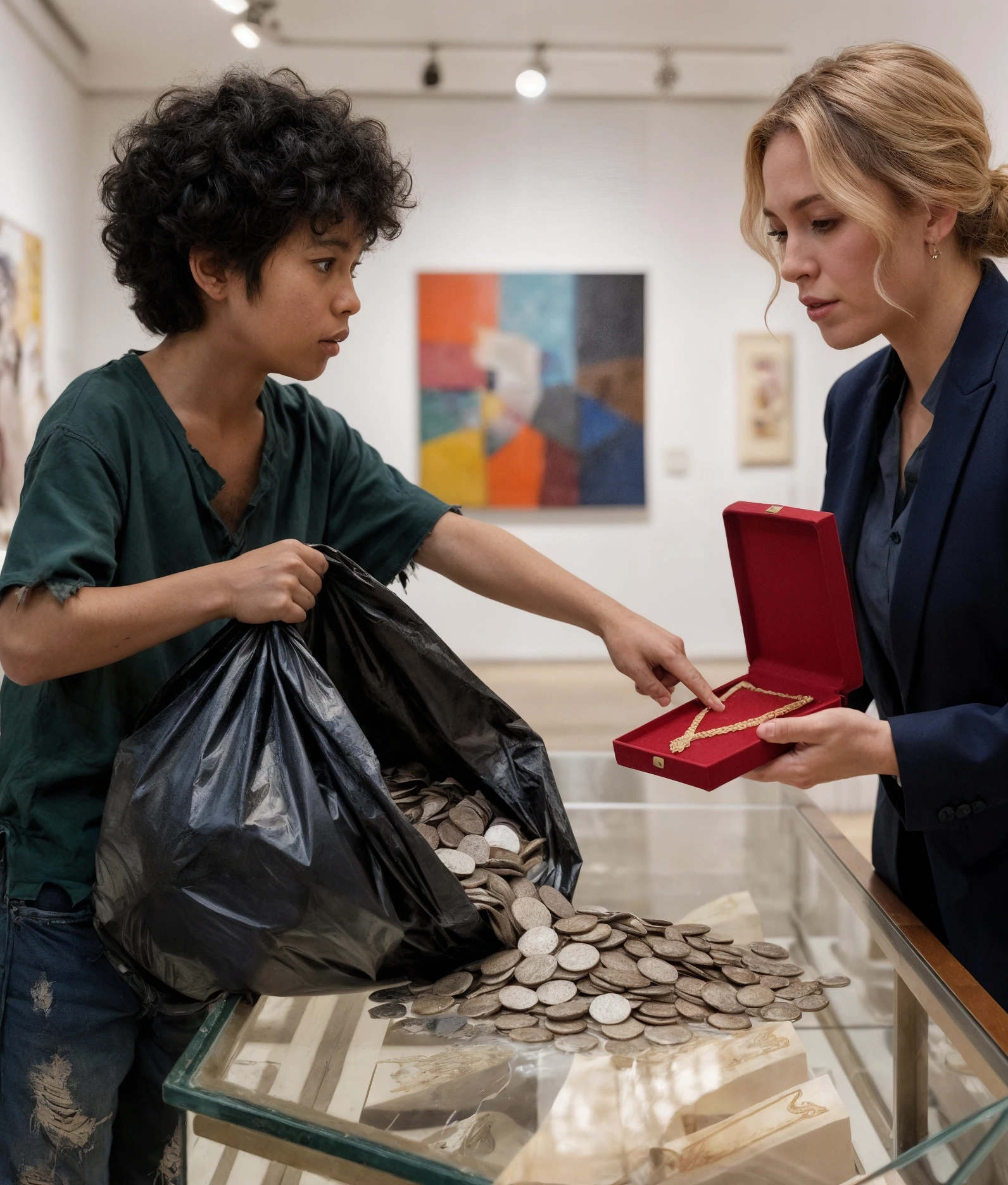 Un ragazzino piccolo e malmesso rovesciò in silenzio migliaia di monete sul bancone di vetro di una gioielleria di lusso.