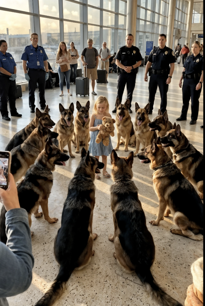 L’aria nel terminal cambiò all’istante. La curiosità dei passeggeri divenne confusione e poi paura, una paura tangibile. Mark sentì un nodo stringergli lo stomaco. “Che succede?”, sussurrò uno dei colleghi. Mark non rispose: aveva gli occhi puntati su Rex. Il cane emise un ringhio basso, profondo, che sembrò vibrare nel pavimento, e in pochi secondi i quattordici pastori tedeschi circondarono la piccola bionda. Non la stavano attaccando, ma non la lasciavano nemmeno uscire. Formarono un cerchio perfetto, un muro di pelo e denti, e la fissarono con un’intensità che gelava il sangue.