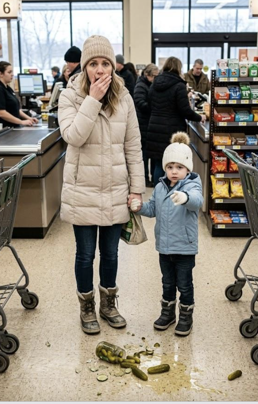 La sua presa si allentò, e il barattolo di vetro dei sottaceti le sfuggì di mano e si ruppe sul pavimento tra di noi. Pezzi di verde, salamoia e vetro rotto schizzarono ovunque, ma lei non sussultò né sbatté le palpebre!