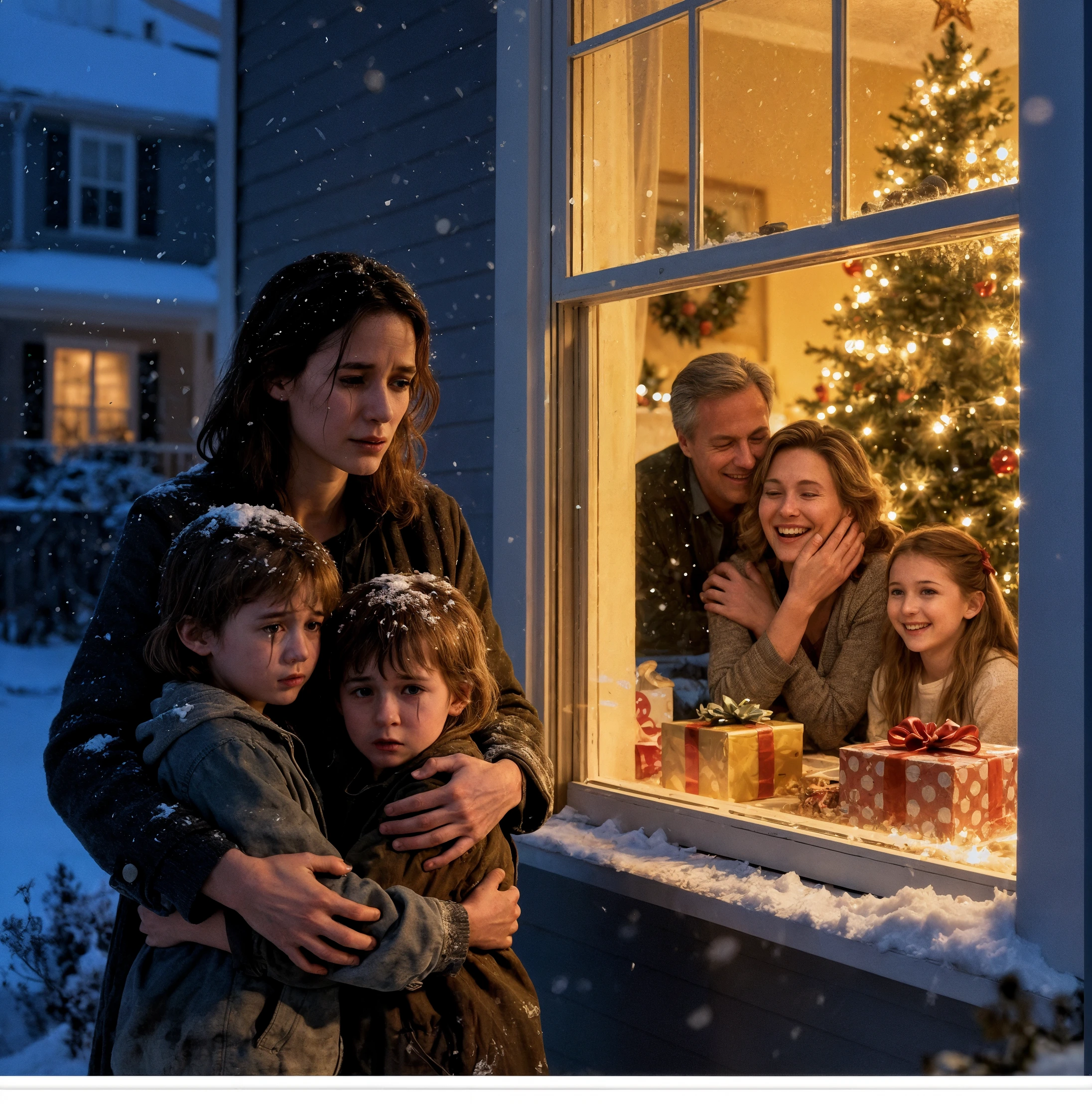 Tutti festeggiavano dentro — mentre lei e i suoi figli stavano fuori al freddo…